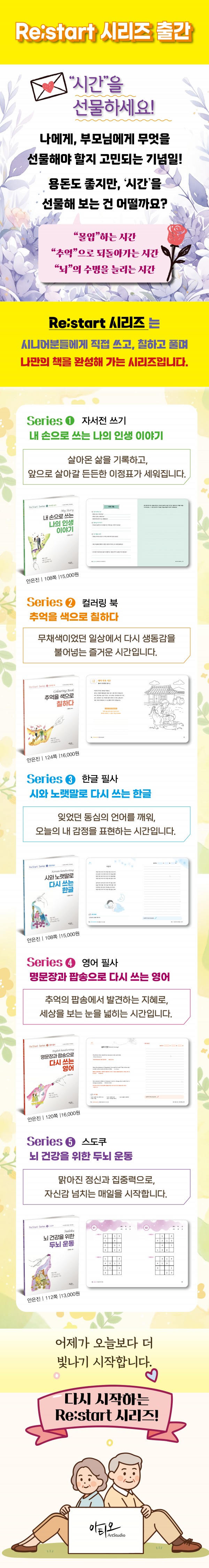 Re:Start Series는 시니어를 위한 라이프 가이드북 시리즈로, 삶의 전환점을 맞이한 당신이 를 다시 만나고, 다시 발견할 수 있도록 돕습니다. 이 시리즈는 일, 관계, 건강, 취미 등 다양한 주제를 통해 은퇴 이후의 삶을 풍요롭고 의미 있게 설계할 수 있는 영감을 제공합니다.